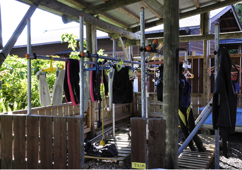 八丈島は突然のスコールなど多く、屋根つきの干場は必需品。広いスペースでグループが重なっても大丈夫。事前に器材を送っていただいても大事に保管いたします。